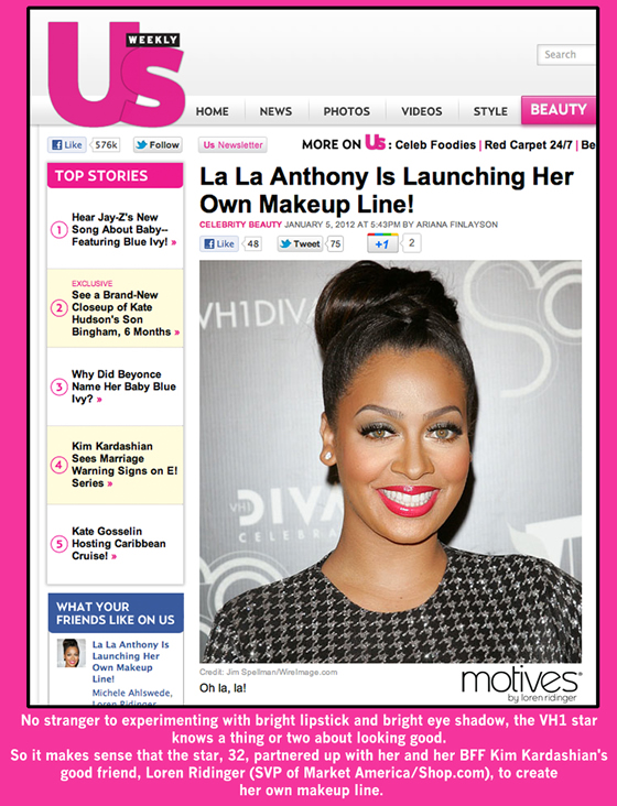 “No stranger to experimenting with bright lipstick and bright eye shadow, the VH1 star knows a thing or two about looking good. So it makes sense that the star, 32, partnered up with her and her BFF Kim Kardashian’s good friend, Loren Ridinger (SVP of Market America/SHOP.com), to create her own makeup line.”